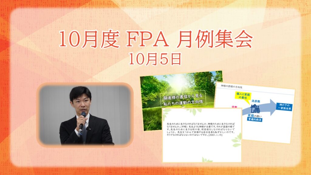 10月5日、恒例の月例集会が行われ、第一部では櫻井正実会長より、「顯進様の書信から見る私たちの運動の方向性」というテーマで礼拝メッセージがありました。会長は、今の時を「天宙史的葛藤の終わりが見え始めた転換期」とし、私たち一人一人が神様の摂理に対するオーナーシップ(主人意識)をもって行動すべき時であると強調。信仰の中心は“人”ではなく“神と原理・摂理”にあるべきだと説かれ、宗教を超えた「神のもとの一家族世界」実現へと進むよう呼びかけられました。
